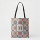 Das Design dieser Tasche basiert auf den Themen Blume und Retro-Kunstmuster. Die Farben Blau, Rot, Orange, Gelb, Grün und Rot werden mit Blumenmotiven gestaltet, die das Muster bilden, mit einem beigen Hintergrund als zusätzliche Farbe. In der Mitte der Tasche befindet sich ein grüner Rahmen, in dem Sie Ihr Monogramm personalisieren können. Auf beiden Seiten des Totbeutels befinden sich die gleiche Konstruktion und das gleiche Monogramm. Das ideale Geschenk für Freunde, nahe Verwandte oder Familienmitglieder.