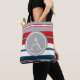 Nautisches Design mit Monogramm-Dekoration in runder Form auf blau, weiß, rot und grau gestreiftem Hintergrund