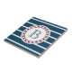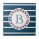 Nautisches Design mit Monogramm-Dekoration in runder Form auf blau-weiß gestreiftem Hintergrund