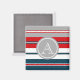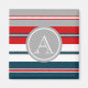 Nautisches Design mit Monogramm-Dekoration in runder Form auf blau, weiß, rot und grau gestreiftem Hintergrund