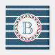 Nautisches Design mit Monogramm-Dekoration in runder Form auf blau-weiß gestreiftem Hintergrund