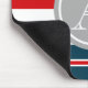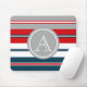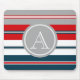 Nautisches Design mit Monogramm-Dekoration in runder Form auf blau, weiß, rot und grau gestreiftem Hintergrund