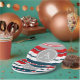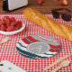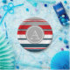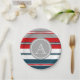 Nautisches Design mit Monogramm-Dekoration in runder Form auf blau, weiß, rot und grau gestreiftem Hintergrund