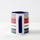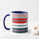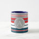 Nautisches Design mit Monogramm-Dekoration in runder Form auf blau, weiß, rot und grau gestreiftem Hintergrund