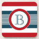 Nautisches Design mit Monogramm-Dekoration in runder Form auf blau, weiß und rot gestreiftem Hintergrund