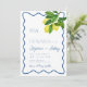 At the top, the couple’s monogrammed initials set a refined tone, followed by the wedding details beautifully arranged within the flowing blue border. The combination of classic typography, fresh lemon accents, and calming blue waves creates a timeless yet cheerful invitation style.