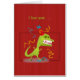 Ein Cartoon-Bild eines niedlichen Limettengrün-Monsters mit riesigen weißen Zähnen auf einem roten Hintergrund mit dem Text "I Liebe your". Diese Karte wäre perfekt, um sie einem Freund als Witz zu schicken.