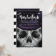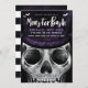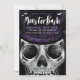 Monster bash Skeleton-themed Halloween party invitation design. The design features our own hand-drawn illustration of a close-up view of a Skeleton monster face wearing a dark purple top hat. "Monster Bash" is displayed in a stylish brush script handwriting in white with the Halloween party details displayed over the skeleton artwork to create a bold and unique Halloween party invitation design. The reverse side features a grungy and rustic black and purple stripe design. All illustrations contained in this bold Skeleton Halloween theme invitation are hand-drawn original artwork by Moodthology.