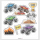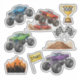 Rev up your gear and personalize your world with this high-octane collection of monster truck vinyl stickers! This exciting set features four colorful monster trucks (blue, red, green, and purple) in action, along with race day graphics like a gold winner's trophy, checkered flags, a "Start" flag, dirt mounds, and silhouettes of a cheering crowd with flames. The dynamic, action-packed illustrations capture the thrill of a monster truck rally.