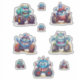 Dieses farbenprächtige Aufkleber-Blatt enthält verschiedene spielerische Monster-LKWs mit jeweils einzigartigen Designs und Ausdrücken.