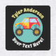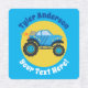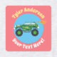 Farbenfrohe Monster Trucks mit personalisiertem Namen und Botschaft auf orangefarbenem, aquamarinem, schwarzem und blauem Hintergrund mit pfirsichblauen, aquamarinen und gelben Mittelkreisen. Verwenden Sie, um Gegenstände von Kindern aus dem Vergehen behalten, oder um Ihre Sachen zu dekorieren.