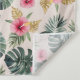 Ein lebendiges Aquarellmuster mit üppigen Monstera-Blätter und rosa Hibiskus-Blume, mit goldenem tropischem Blattwerk. Ideal, um eine Touch Paradies in jedem Raum oder Produkt zu bringen.