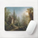 Dieses Design zeigt ein Gemälde des österreichischen Künstlers Albert Rieger (1834-1905). Es zeigt ein elegantes kirchliches Gebäude in ländlicher Umgebung mit hohen Bäumen und grünem Laub. Zwei Männer reiten Pferde über eine Brücke über einen Fluss. Die helle Sonne geht auf, während der Abend zeichne.