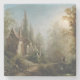 Dieses Design zeigt ein Gemälde des österreichischen Künstlers Albert Rieger (1834-1905). Es zeigt ein elegantes kirchliches Gebäude in ländlicher Umgebung mit hohen Bäumen und grünem Laub. Zwei Männer reiten Pferde über eine Brücke über einen Fluss. Die helle Sonne geht auf, während der Abend zeichne.