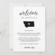 Teilen Sie Ihre Begrüßungsbotschaft für Ihre Hochzeitsgäste in Montana sowie eine Route oder einen Zeitplan für die Veranstaltungen am Wochenende. An der Vorderseite finden Sie Ihre Begrüßungsbotschaft mit einer Silhouette des Staat von Montana mit einem Innenhof. Auf der Rückseite des Hotels können Sie Ihren Hochzeitstag oder Ihr Hochzeitswochenende individuell gestalten. Ideal, um in Begrüßungssäcke des Hotels zu übernachten oder um die Zimmer Ihrer Gäste zu versenden.