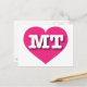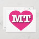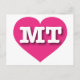 Auf dieser Postkarte befindet sich ein pulsierendes, heiß rosa Herz, das die fett-, weiß-, Großbuchstaben MT, die offizielle Abkürzung für Montana, den Schatz-Staat, enthält. Die Rückseite der Postkarte ist leer und wartet auf Ihren personalisierten Text oder Ihre handgeschriebenen Gefühle.