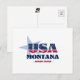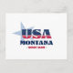 Montana Postkarte. Ein kreatives Typografie-Design, das Montanas Essenz mit kühnen Rot-, Weiß- und Blautönen und patriotischen Elementen, einschließlich US Flagge, verkörpert.