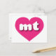 Diese Postkarte zeigt ein pulsierendes, heiß rosa Herz mit den fett gerundeten, weißen Kleinbuchstaben Millitorr, eine spielerische Abkürzung für Montana, den Schatz-Staat. Die Rückseite der Postkarte ist leer und wartet auf Ihren personalisierten Text oder Ihre handgeschriebenen Gefühle.