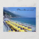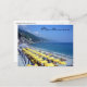 Postkarte des Strandes von Monterosso al Mare, Cinque Terre, Italien. Vollständig anpassbare Postkarte. Monterosso ist eine Stadt und Gemeinde in der Provinz La Spezia, Teil der Region Ligurien (Norditalien). Es ist eines der fünf Dörfer in Cinque Terre. Die Stadt ist in zwei Teile geteilt: die Altstadt und die neue Stadt. Die beiden Bereiche sind durch einen Single-Tunnel unterteilt, der Fußgängern und den wenigen Autos der Stadt dient. Der Strand von Monterosso erstreckt sich über den größten Teil der Küste und wird von Touristen und Einheimischen gut besucht. Der Strand ist der einzige weitläufige Sandstrand der Cinque Terre. Monterosso ist eine kleine Stadt, die im Sommer von Touristen überlaufen wird.