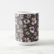 Moody Boho Watercolor Blush Wildflowers Pattern Coffee Mug to start your day right. A perfect gift for someone who loves a moody romantic vibe. Coordinating with a range of home decor products using the same design and colors, this moody, dramatic botanical pattern features lush watercolor wildflowers in soft blush, lavender, and peach hues, set against a deep charcoal grey background. The high-contrast design captures the spirit of Dark Academia and Maximalist decor, offering a sophisticated, luxurious touch for your home decor. The painterly style and rich color palette ensure a beautiful, high-end look."
