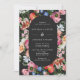 Eine stimmungsvolle, aber farbenfrohe Hochzeitseinladung mit mehrfarbigen Aquarellfarben im niederländischen Masters-Stil, noch lebendige Blume rund um einen angesagten Pillenrahmen, auf kohlebeständigem Hintergrund. Die Rückseite weist ein Muster von Blume auf.