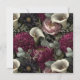 Ein luxuriöses und kompaktes, nahtloses Muster mit einem Strauß an Blume in einem dunklen, mooösen Stil. Die Komposition umfasst große, tiefbordeauxrote und dunkle lila Dahlien, elegante weiße Calla-Lilien und weiche rosafarbene Pfannkuchen. Das Blattwerk besteht aus gedämpften, graugrünen Blätter und zarten Beeren, die alle Set auf einem soliden schwarzen Hintergrund bilden. Die kräftigen Farben und die detaillierten Texturen verleihen dem Bild ein dramatisches und Vintages Gefühl.