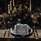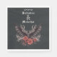 Dunkelmoodie, gotische Hochzeitsnapkins mit Namen und datiert in Old English Goth Kalligrafie - Holzkohle schwarzer Hintergrund mit offenem Flügelschläger und getrocknetem Blumenspray in Holzrose und schwarz - leicht zu individualisierende Vorlage - Entworfen von WhimsicalArtwork™ für den BarefootBride ™.