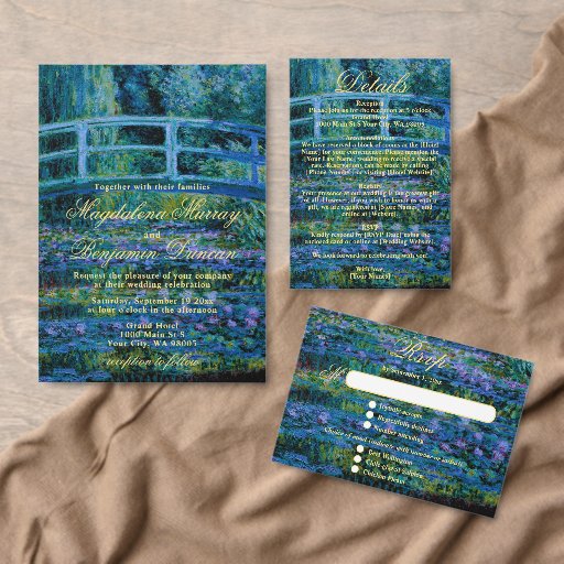 This fine art wedding stationery design captures the romance of impressionist brushstrokes and the serenity of Monet’s water garden, making it perfect for art-inspired weddings, moody evening receptions, and romantic outdoor or botanical garden venues.