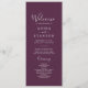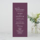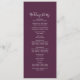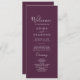 Dieses stimmungsvolle lila Koordinatenpflaumenprogramm eignet sich perfekt für eine moderne Hochzeit. Das elegante Boho Juwel Tondesign besticht durch eine solide, dunkle Auberginen-lila Farbe mit einem modernen böhmischen Ambiente. Koordiniert mit der Moody Lila Blooms Collection von Fresh & Yummy Paperie. Geben Sie die Namen des Paares, das Datum und den Ort der Hochzeit, Dankeschön-Nachricht, Dienstorden, Hochzeitsfeier und ein optionales "in Loving Memory"-Denkmal ein.