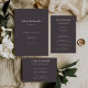 A moody minimal wedding details card featuring refined typography and a sophisticated dark palette. Perfect for modern, formal, or evening weddings, this design brings an editorial, high-end feel to your stationery suite. Includes space for ceremony, reception, accommodations, dress code, and RSVP details—fully customizable for a seamless and elegant guest experience.