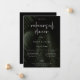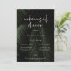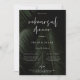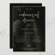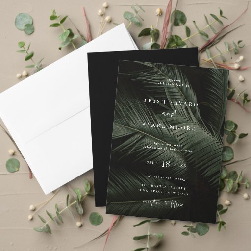 Moody Tropics, Einladung zum Probe Dinner. Dunkle tropische Palmenblattfotografie mit dunkelweißer Typografie. Die Rückseite der Karte zeichnet sich durch eine solide koordinierende schwarze Farbe aus.