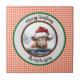 This charming and funny ceramic tile features a cute baby highland cow wearing a Santa hat on a snowy day, personalized with your or your recipient' name. This festive Christmas cow is trimmed in red and green, and the image is set against a farmhouse chic red gingham border. Edit the greeting if you want, and make sure to type the name you want in the Personalize box.