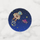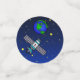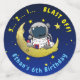 Moon Adventure Birthday Confetti zeigt einen Astronauten, der aus einem Halbmond posiert, mit Sternen um ihn herum. Raumstationen, Astronauten, Planeten und Sterne. Der individuell anpassbare Kurvetext über dem Astronauten sagt: "3...2...1... Blase ab!" Im folgenden Text steht "Ethan's 6th Birthday". Set der perfekte Geburtstagstisch für kleine Raumfans mit Moon Adventure Confetti.