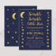 Eine preisgünstige Babydusche mit goldenen Sternen und Mond an der links und rechten Grenze. Es hat marineblauen Hintergrund. Der Text ist goldgelb und weiß. Der Titel "Twinkle Twinkle Little Star" und der Name sind in einer goldenen Handschrift geschrieben, mit kleinen Sternen auf der i in den Worten "Twinkle". Auf der Rückseite sind nur Sterne und der Mond.