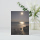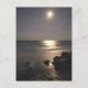 Atemberaubende Strandfotografie mit dem aufsteigenden Mond, die ein cooles Licht auf den Ozean wirft, während die Felsen und Umgebung in Schatten geworfen werden.