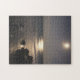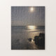 Atemberaubende Strandfotografie mit dem aufsteigenden Mond, die ein cooles Licht auf den Ozean wirft, während die Felsen und Umgebung in Schatten geworfen werden.