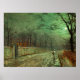 Poster mit John Atkinson Grimshaw's Gemälde A Moonlit Abend (1880). Ein heimlicher Mond füllt den Nachthimmel des Viktorianischen Englands, als eine Frau in einer von Bäumen gesäumten Straße steht. Vor ihr ist ein beleuchtetes Gebäude. Ein großartiges Geschenk für Liebhaber der Romantik und des Viktorianischen Englands.