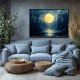 Dieses bezaubernde abstrakte Kunstwerk zeigt eine ruhige Nachtlandschaft, in der ein glühender Vollmond über einen ruhigen Wasserweg reflektiert, der von gewaltigen Waldbäumen gerahmt ist. Die kühnen Texturen, die mit groben Palettenmesserstrichen kreiert wurden, bringen die friedliche, aber mystische Landschaft zum Leben. Mit tiefer Blues und goldenen Highlights verbindet das Gemälde den Expressionismus moderner Kunst mit minimalistischen Formen und eignet sich somit ideal für diejenigen, die abstrakte und naturlich inspirierte Wanddekorationen schätzen.