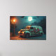 Eine faszinierende Leinwand, die einen Vintagen Van mit einem auffallenden Schädel und einem Motiv aus Rose zeigt, geparkt auf einer Kopfsteinpflasterstraße unter dem Licht eines Vollmonds. Das warme Licht einer einsamen Straßenlampe beleuchtet das Retrofahrzeug und wirft weiche Schatten über den Boden. Die stimmungsvolle Szene wird durch zwei Fledermäuse, die über den Himmel fliegen, noch verstärkt, was den Vintagen Charme mit einer Touch des Makabres verbindet. Dieses Kunstwerk erinnert sowohl an Nostalgie als auch an Rätsel und macht es zu einem faszinierenden Werk