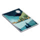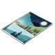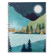 Eine wunderschöne Landschaft mit einzigartigen Texturen, die eine Berglandschaft mit aufsteigendem Mond und Sternenhimmel in den Farben Blau, Gold, Grün und Türkis zeigen.