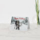 Eine Urlaubskarte mit Elch im Winterschnee in der Wildnis. Ein großartiger Urlaub für Freunde und Familie. Fett rote festliche Schrift gegen ein schönes Foto.