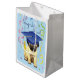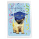 Beglückwünschen Sie Ihren Lieblingsabsolvent mit einem Geschenk in einer Tasche, die ein niedliches kennzeichnet, wenig, der glückliche Mopsabsolvent, der einen Mortarboard unter einer Aufregung von Confetti trägt.
