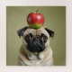 Der sonnige Mops mit einem Apfel, der auf seinem Kopf ausbalanciert.
