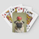 Der sonnige Mops mit einem Apfel, der auf seinem Kopf ausbalanciert.