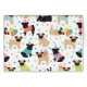 Cute birthday party Pug dogs with black and tan coats dressed in cute birthday outfits with ballons, cake and confetti pattern.