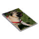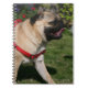 Mops, der rotes Geschirr trägt Notizblock