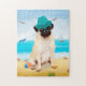 Ein Mops, der am Strand sitzt, ist eine gute Geschenkidee für jemanden, der diese Hundin Liebe.