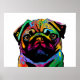 Ein heller und farbenfroher Pop-Kunstdruck eines Mops Dog auf weißem Hintergrund.