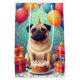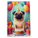 Eine lustige und fröhliche Geburtstagsszene mit einem Mops, der eine festliche Feier genießt, umgeben von farbenfrohen Ballons, Geschenken und einer strahlenden Geburtstagstorte. Der spielerische Ausdruck und die lebendigen Details schaffen ein freudvolles Design voller Charme und Persönlichkeit