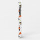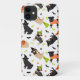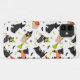 Niedliche Möpsen in Halloween-Kostümen und Trick-oder-Behandlung mit Pfotendrucken, Fledermäusen und Hundeknochen auf weißem Hintergrund.